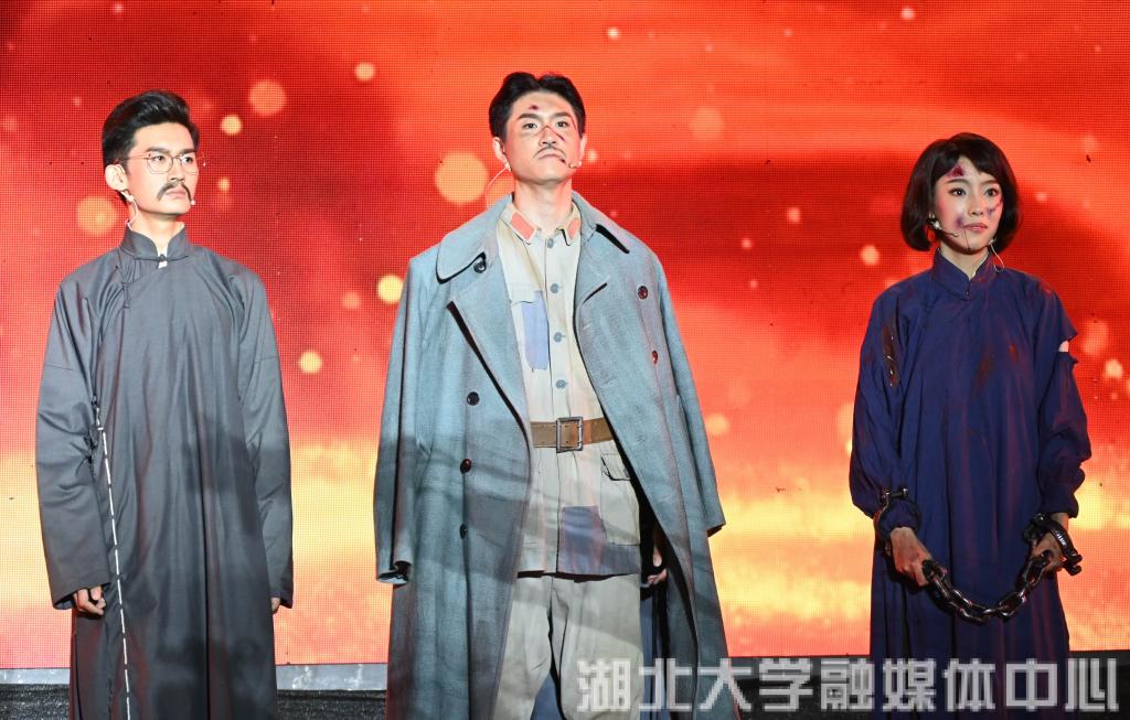 演员扮演的方志敏、李大钊、赵一曼上台,与现场的青年们展开了一段跨越百年的“对话”。“100年前,中国青年在民族危亡的时刻觉醒,手握星火,苦苦探寻民族复兴的前途;100年来,中国青年在强国复兴的征程接力,勇当先锋,积极投身伟大梦想的实践。”新闻传播学院学生聂韵昕表示,时代各有不同,但是青春一脉相承,自己使命与责任将永远牢记心间。